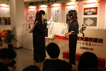 随后,档案馆(校史馆、博物馆)展教部花苑老师为各位同学释读校徽元素的组成,同时展示馆藏珍贵档案——陈云为学校题写的校名手迹,向同学们讲述陈云同志与我校的渊源,一起回顾了学校更名为“上海财经大学”的历史。