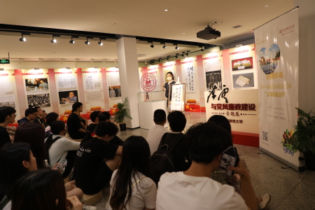 首先,由学校“党的二十大精神”师生宣讲团成员、“育衡宣讲”队员2022级马克思主义学院研究生王澳卫为各位同学导览讲解“陈云与党风廉政专题展”。他以一个个生动的人物故事串联起陈云同志在党风廉政建设方面的思想和实践,引导同学们与这位“共和国掌柜”跨越时空对话,感受伟人风采与崇高精神。