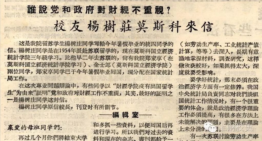 1957年《上海财经学院院刊》第64期第4版:留苏学生杨树庄从莫斯科写给母校的来信