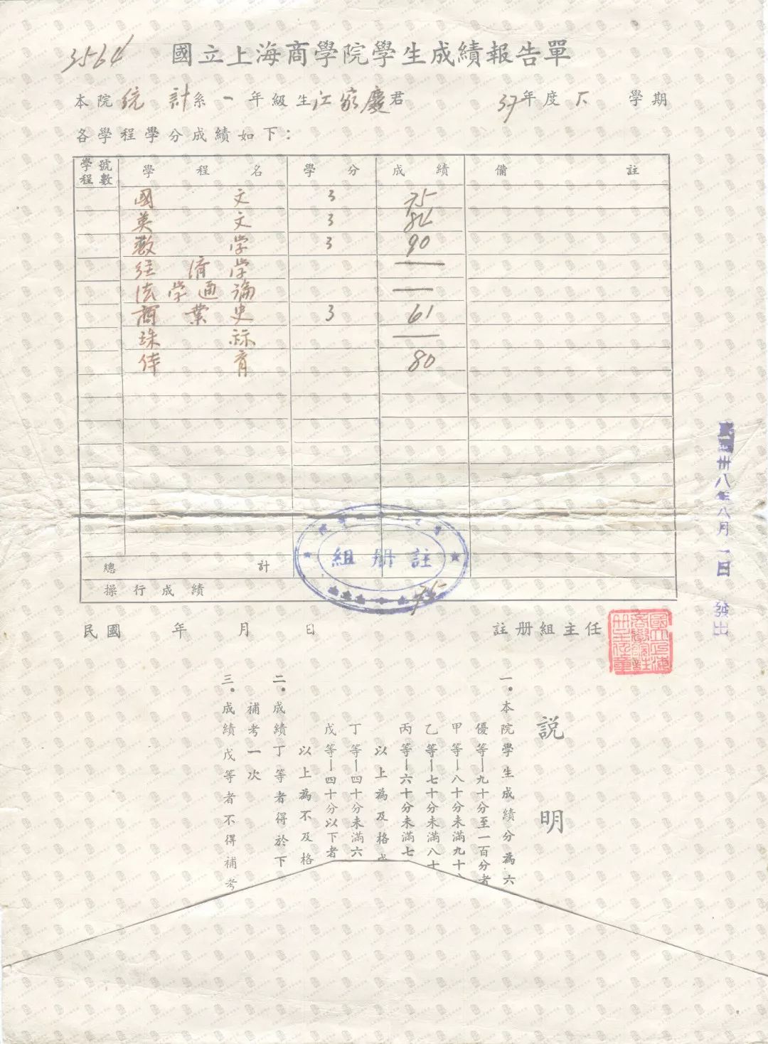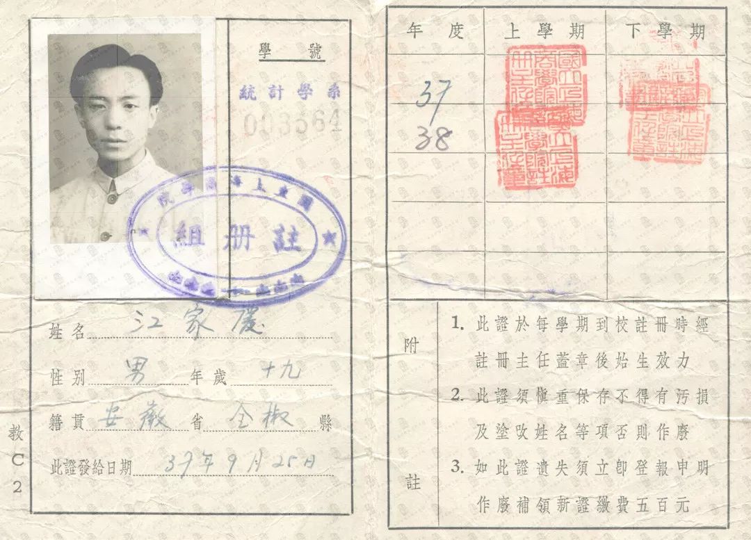 国立上海商学院注册证-1948级统计学系江家庆