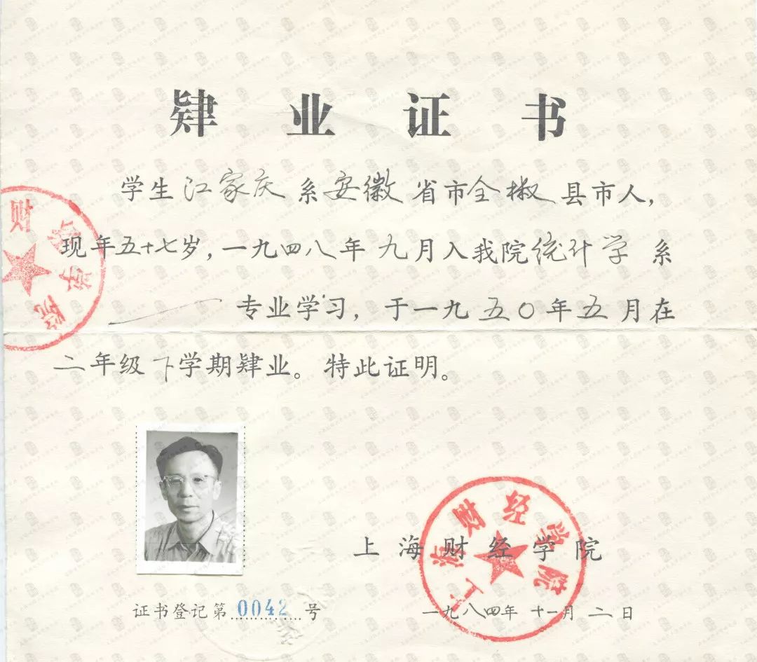上海财经学院开具的江家庆肄业证书(1984年11月)