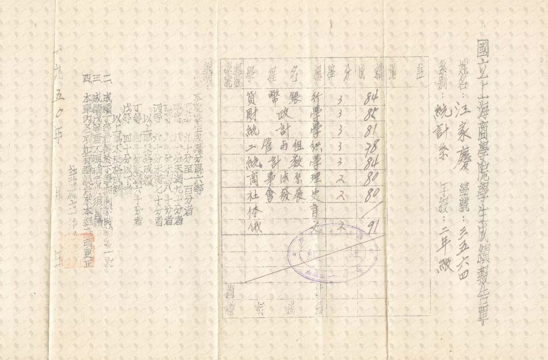 国立上海商学院成绩报告单-1948级统计学系二年级江家庆(1950年)