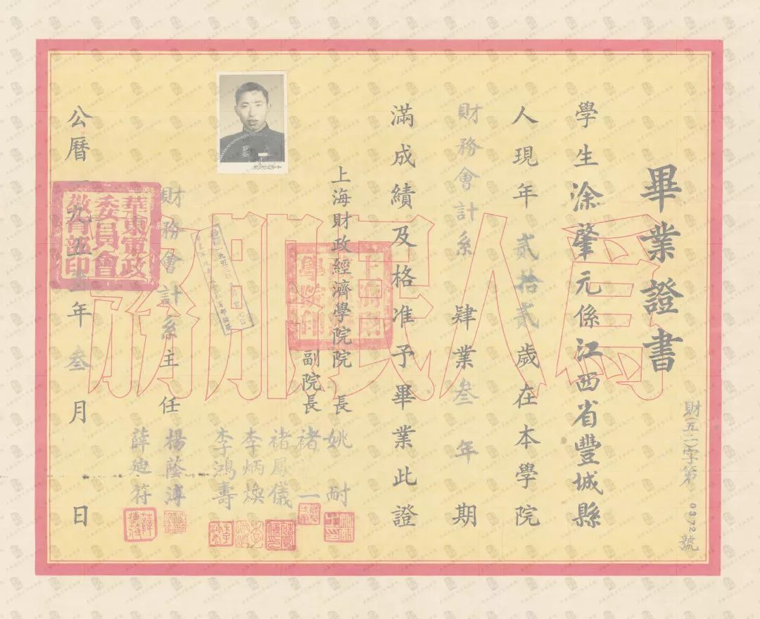 上海财政经济学院财务会计系涂肇元毕业证书(1953年3月)