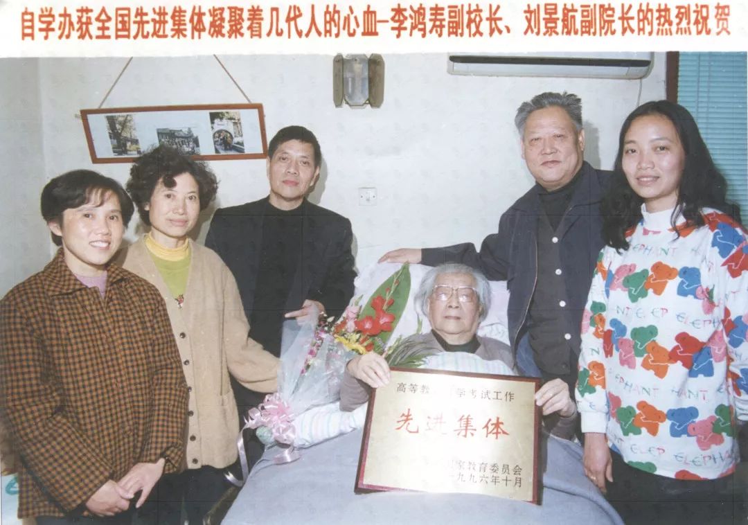 我校自学考试办工作获得全国先进集体后看望李鸿寿副校长(左起:金涤心、杨淑玉、范正威、李鸿寿、刘景航、李军)(1997年11月)
