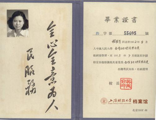 我记得是有一次开大会,姚院长坐在我后面,我一看是姚院长,赶紧和他打招呼。他说我送你到人大去好不好?我说太好了,什么时候走?他说明天走。我没想到明天就走,去人大读书一点心理准备都没有,而且他通知我的时候我也很高兴,主要是觉得当老师知识不够,大学没学到理论和知识。他们把我送到第四人民医院体检,就在山阴路旁边,北四川路医院里面检查下来也没什么问题。我一回到学校就整理东西,第二天就走了。去的时候大概已经是1952年10月下旬,我们大概有10个人一起过去的。那个时候人家讲你们上海来的都是资产阶级小姐。所以,我们去的时候一到北京,下车就去买了列宁装和帽子,军装就穿上了。至于饮食习惯不一样就更明显了,比如我在北京第一次吃到什么叫牛百叶。那时候人大也才成立不久,校长吴玉章是我们党的元老。我们在人大主要是上几门课,第一年主要是学党史,还有政治经济学,到第二年开始学专业课了,合作社理论、农产品采购等,1955年毕业。那个时候合作系的合作社理论与历史就是苏联专家科科列夫讲的,他上课都是用俄文讲,有个翻译,他讲一句翻译翻一句,我们记也记不下来,因为翻译讲话也很快。等到1955年毕业也就是在马列主义方面打了一些基础,并不是很完整。毕业后我就回到财经学院了,那个时候我月工资是94块5毛,我挺开心的。