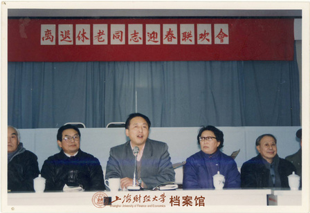 1992年,时任上海财经大学党委副书记兼纪委书记季德元参加离退休同志迎春联欢会(从左至右:王星九、季德元、汤云为、朱沪生、叶麟根)