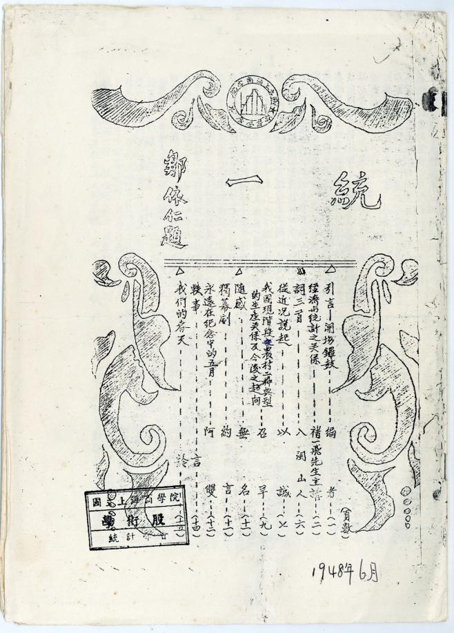 进步刊物《统一》由国立上海商学院统计系学会编辑,1948年6月10日出版,A4大小,刻板油印,共14页。