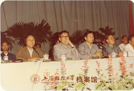 1986年,时任上海财经大学党委副书记张婉如在新生开学典礼上讲话(前排从左至右:张婉如、叶孝理、金炳华、叶麟根)