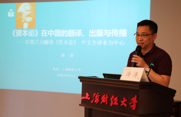 第三方面,是主讲的重点,主要介绍郭大力翻译《资本论》首个中文全译本的时代背景、历史条件,以及在中支持下的翻译出版经过。郭大力毕业于具有革命、创造和牺牲精神的上海大夏大学(该校商学院并入上海财大),他在中共最早的党员、中共上海组织发起人之一邵力子,以及早期的马克思主义者郭沫若、田汉、李石岑等老师影响下,在该校哲学系就读期间,就接触并计划翻译《资本论》,1938年,郭大力翻译的《资本论》第一个中文全译本在上海出版,他终于将这部马克思主义经典巨著以完整的面貌展现在中国人民面前。全面抗战时期,郭大力运用《资本论》原理抨击国民政府的财政政策,同时翻译完成马克思100万余字《剩余价值学说史》。