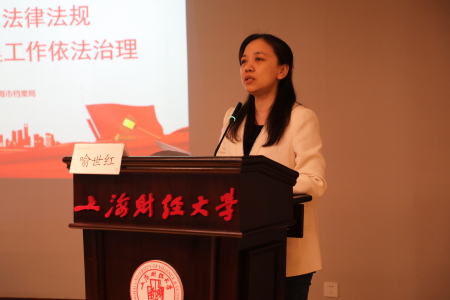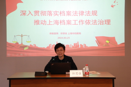 为更好地学习宣传贯彻落实好新颁布的《中华人民共和国档案法》《中华人民共和国档案法实施条例》《上海市档案条例》等法律法规,推动高校档案工作的规范化、法治化和现代化建设,提升高校档案工作人员的业务水平和法律意识,2024年3月25日下午,上海市档案学会高校档案专业委员会在上海财经大学育衡楼三楼报告厅举办档案法律法规专题报告会。本次报告特邀上海市档案局综合规划处处长忻思佳主讲。上海市档案学会高校档案专业委员会会员代表约120人出席会议。本次报告会由上海财经大学档案馆承办,由上海市档案学会高校专业委员会副理事长兼秘书长喻世红主持。