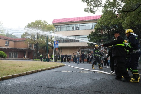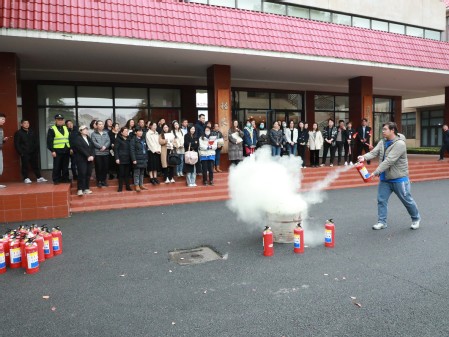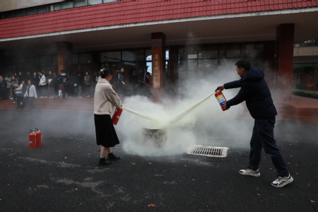 演练完毕,全体人员在育衡楼前室外场地参加消防安全培训,保卫部老师就校园火情报警、初期灭火措施、常用干粉灭火器和消火栓出水灭火的基本操作要领等内容作了详细讲解和示范。参加演练人员纷纷动手尝试,学习掌握实际操作技能。