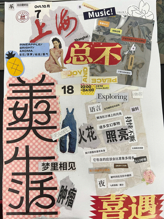 第二场则是别开生面的“SUFE 博物艺趣:在春日里,读图写诗”拼贴诗体验工坊,活动由上海控江中学艺术教师、市级创新实验室文创中心负责人王独伊老师主讲。策展人首先为同学们解构展览中月份牌的画面元素作为引入,随后王老师通过对多幅经典现代主义艺术作品的赏析,科普现代艺术的要素。同学们在两位老师的解读中,一起走进图像式的海派风景中,也进入了美的深层次领域,为之后的诗作创作注入了更多的灵感。2021级会计学院的邓同学表示,这是一场生动有趣的活动,轻松又解压,对月份牌文化也有了更多的了解;2022级公共经济与管理学院的周同学说“拼贴诗的创作不仅仅是对语言的重组,更是对情感的重新诠释。在两位老师的引导下,我可以把不同的情感、记忆和想法融合在一起,形成全新的表达。这个过程就像寻找和组合一颗颗小小的宝石,最终形成一件完整和精美的艺术品。”