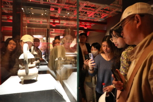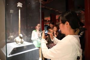 档案员们首先跟随讲解志愿者参观了《相遇海昏侯——西汉刘贺墓精品文物展》。展览共展出海昏侯刘贺墓出土的110件精美文物,包含青铜、黄金、玉器、竹简、木牍等不同材质的制品,分为“豫章海昏”和“王侯威仪”两部分予以展示。海昏侯刘贺墓出土文物种类繁多,内涵丰富,堪称一部反映汉代鼎盛时期璀璨文化的百科全书,对我们了解、感受和研究西汉历史、文化和社会经济发展具有重要价值。