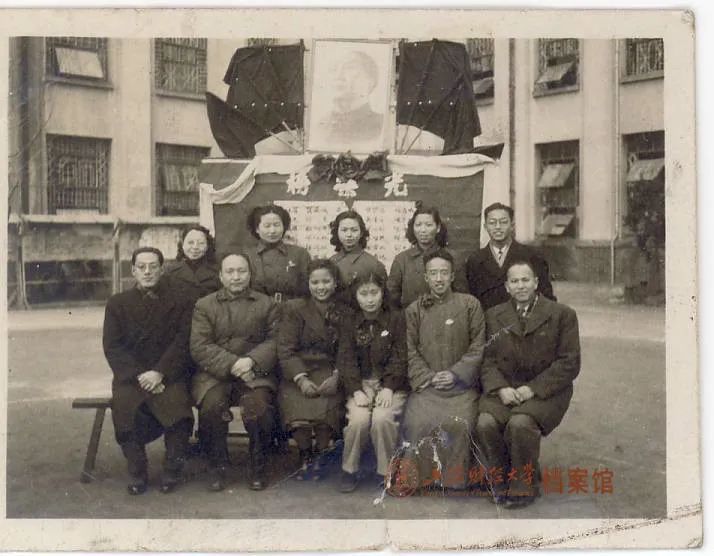 程馥葆(前排左三)与会计系师生(前排左一娄尔行,前排左二许本怡)在学校参干光荣榜前留影(1951年1月)