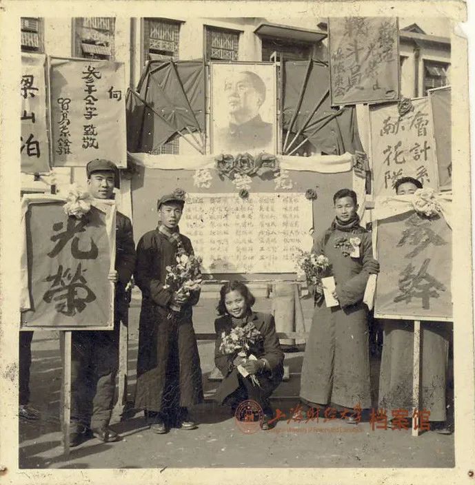 程馥葆(中间蹲者)与参干同学在学校参干光荣榜前留影(1951年1月)