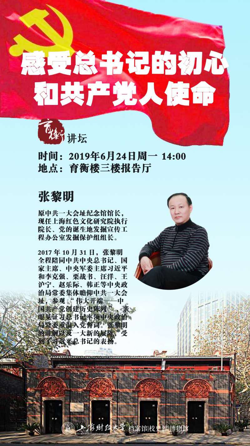 2017年10月31日,在党的十九大闭幕仅一周,中共中央总书记、国家主席、中央军委主席和李克强、栗战书、汪洋、王沪宁、赵乐际、韩正等中央政治局常委集体瞻仰中共一大会址,并重温入党誓词。作为这一重要历史时刻的亲历者和见证者,张黎明馆长回顾了他承担这一光荣而神圣任务的始末,与大家分享了在陪同过程中难忘而珍贵的片段,以及他所真切感受到的总书记的初心和共产党人的使命。