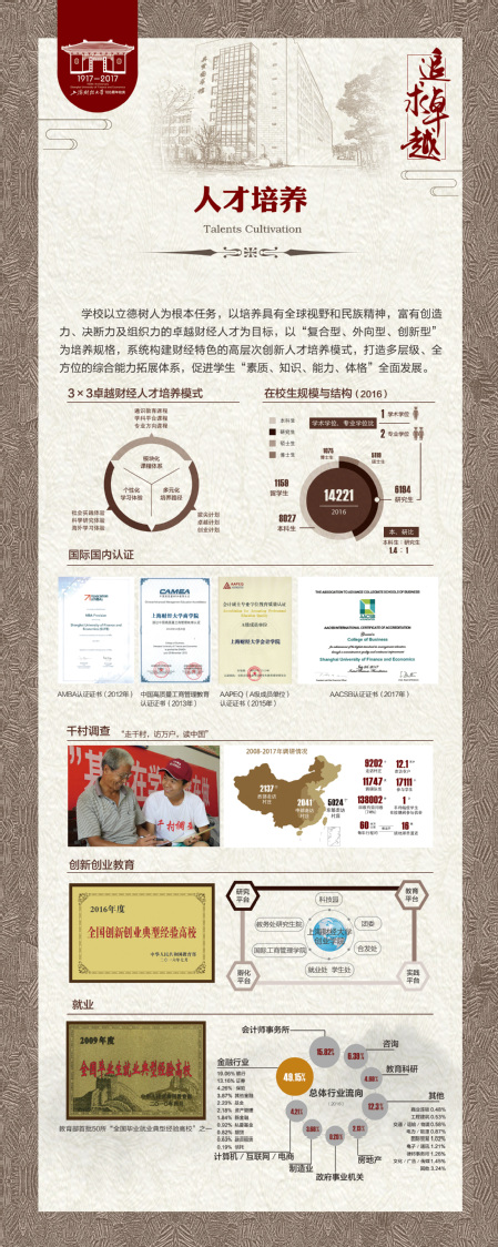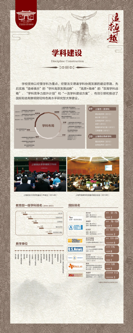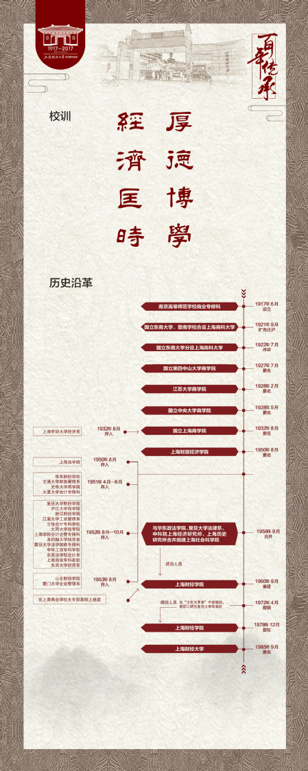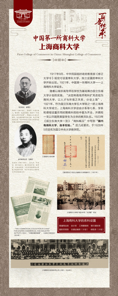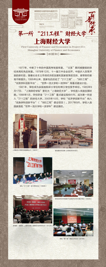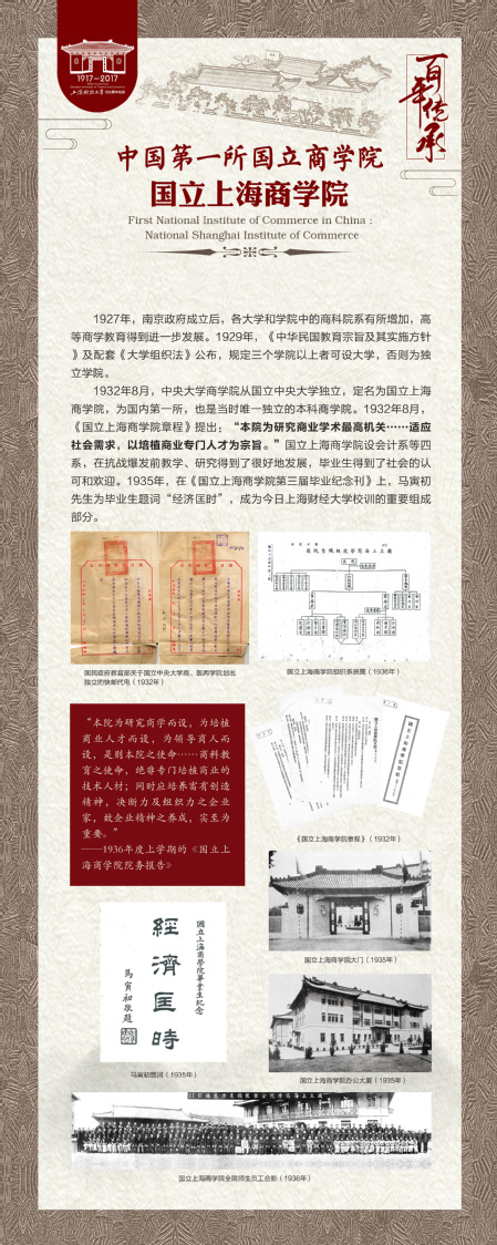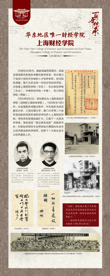 为庆祝我校建校100周年,由档案馆(校史馆、博物馆)、高等教育研究所、发展规划处主办的“百年商学 百年上财——上海财经大学建校一百周年巡展”已完成制作、布展工作,欢迎广大师生、校友前去参观,共同回忆与见证建校百年来学校的变化与发展。