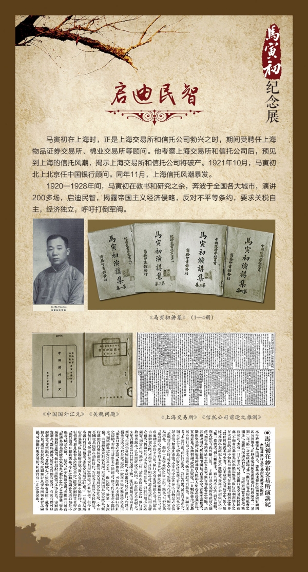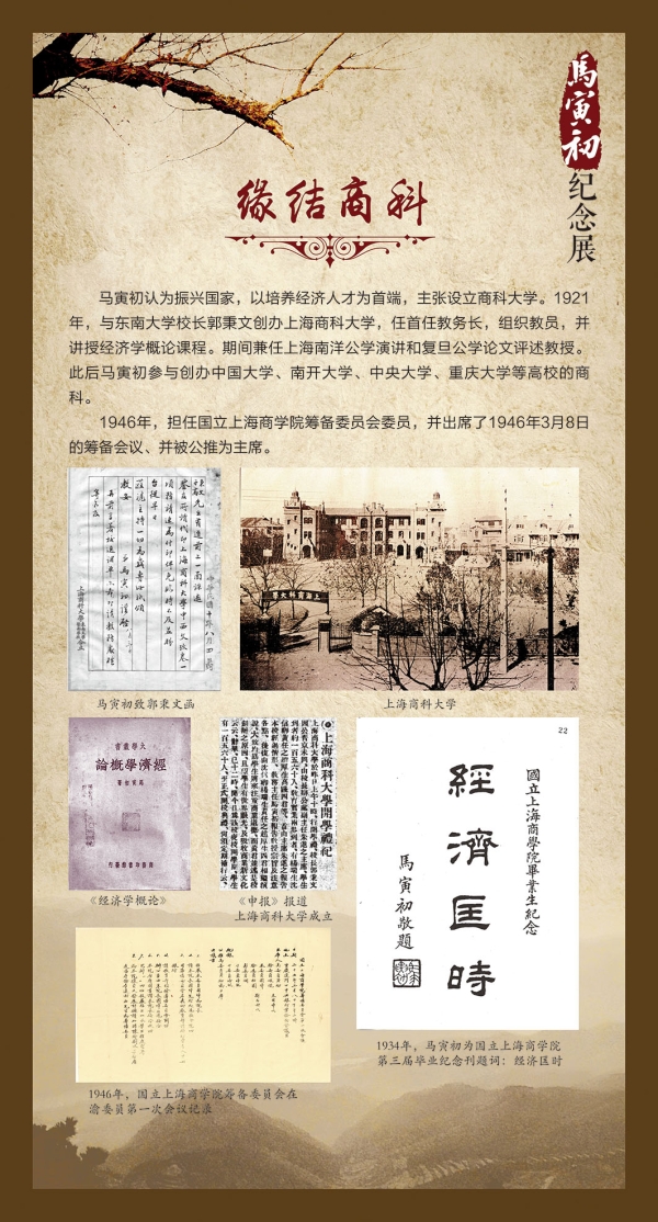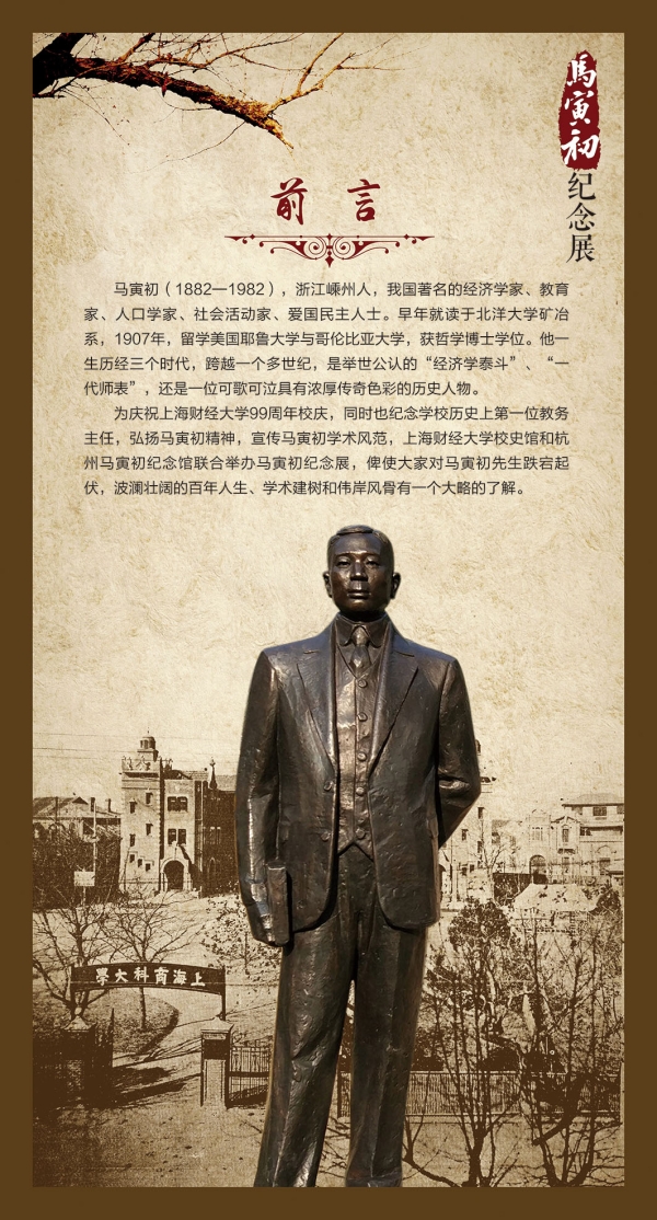 为庆祝上海财经大学99周年校庆,同时也纪念学校历史上第一位教务主任,弘扬马寅初精神,宣传马寅初学术风范,上海财经大学校史馆和杭州马寅初纪念馆联合举办马寅初纪念展,使大家对马寅初先生跌宕起伏、波澜壮阔的百年人生、学术建树和伟岸风骨有一个大略的了解。