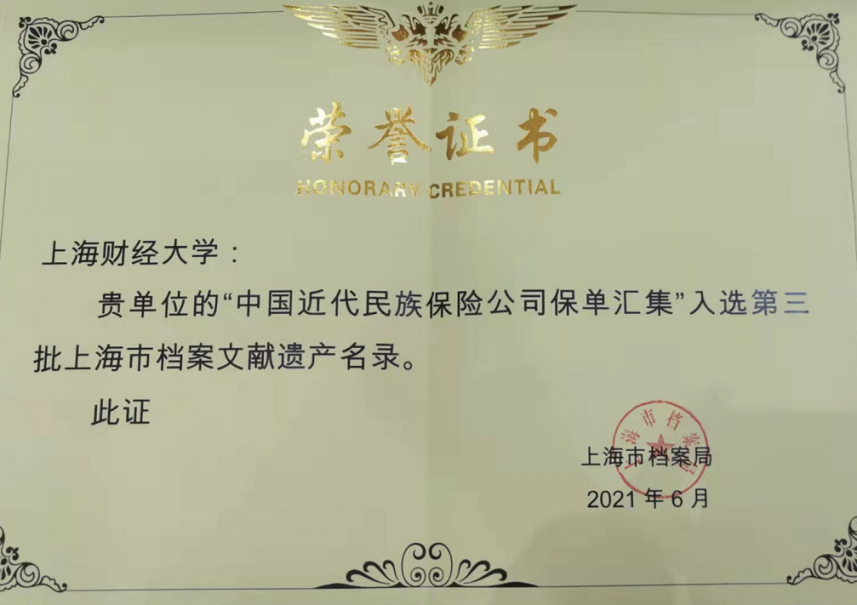 学校档案馆(校史馆、博物馆)现保存以保单为核心的保险类档案文献数量丰富、体系完整、特色鲜明,涵盖了近代中国民族保险发展的各个历史时期,比较全面地记录和展示了近代中国保险业尤其是民族保险业的发展历程,具有良好的历史、文化、艺术与研究价值。为了保护和传承好这批保险类档案文献,学校建成了保险馆、编辑出版了《上海财经大学博物馆馆藏集萃·保险卷》,并扎实做好藏品数字化和保护复制等工作。