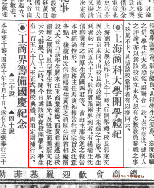 1921年9月29日,《申报》第14版刊登“上海商科大学开学礼纪”,文中写道:“上海商科大学于昨日上午十时,行开学礼,校长郭秉文因公晋京未回,由校长办公处副主任朱进之主席,学生到者约一百五六十人……首由主席朱进之报告本校经过情形,教务主任马寅初报告教授宗旨及注意各点,后复由沈信卿、杨端生、黄任之、赵厚生四君相继演说,大致均勖学生将来注重商业道德……且望学生有世界眼光,及吸收商业新文化云云。……辞毕,已十二时”。