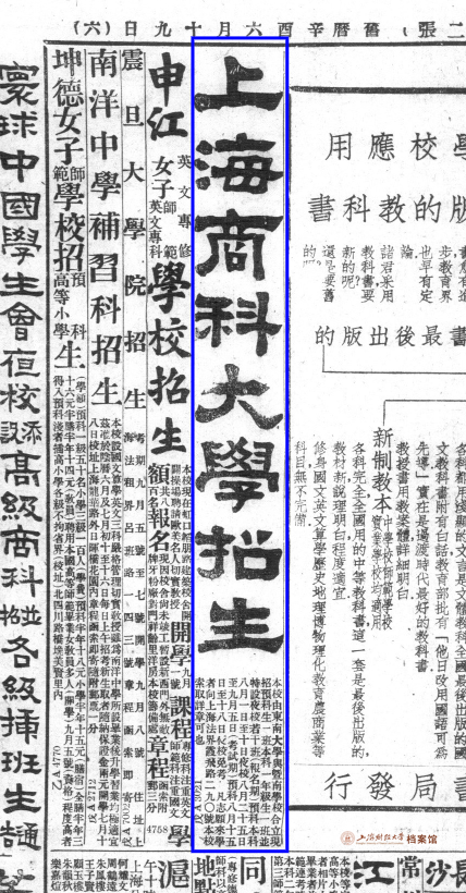 7月23日,在中国共产党第一次全国代表大会召开的同日,在《申报》和《时报》上刊载了上海商科大学的第一份招生广告。