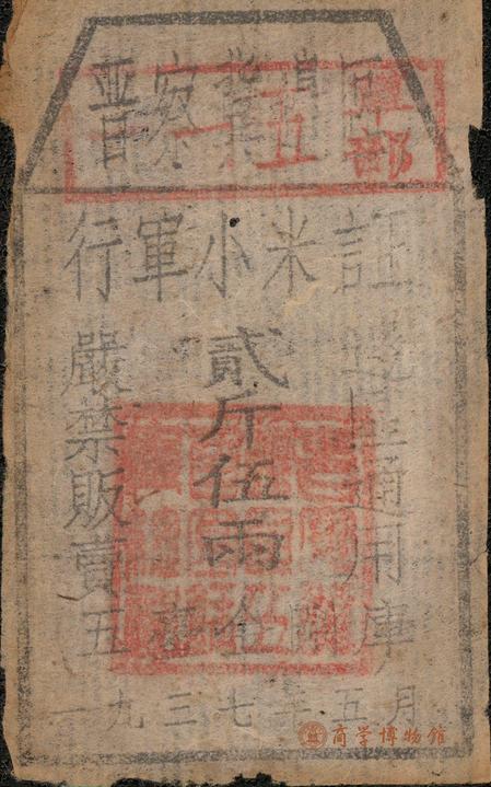 展览共展出三枚“晋察冀边区行军小米证”,为白色毛边纸材质,票证上面印有“晋察冀边区行军小米证”,中间印有面额“贰斤伍两”,两侧印有“边区通用”“严禁贩卖”字样,下方显示其发行地为“五台金岗库”,发行时间为“一九三七年五月”。并加盖“晋察冀军区五台金岗库总部”及“一一五军部”的红色印章,其中有一枚还印有“晋察冀边区政府委员会”的红色印章。
