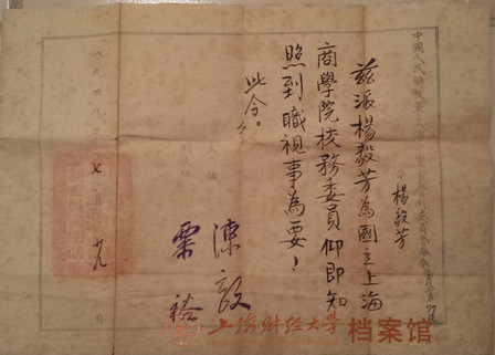 1949年7月29日,中国人民解放军上海市军事管制委员会任命国立上海商学院校务委员杨毅芳令