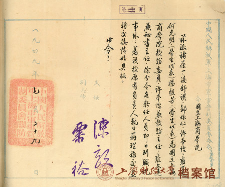 1949年7月29日,中国人民解放军上海市军事管制委员会任命国立上海商学院校务委员令