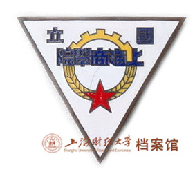 由于特色鲜明、主题突出,他设计的校徽方案一下子便从众多应征方案中脱颖而出,被学校采纳并印制成实物发给了师生。仔细观察这枚三角形的校徽,它白底上镌刻着蓝色的国立上海商学院的校名,正中间由金色的麦穗和齿轮组成一个圆形,在圆形的正下方缀着一枚红艳欲滴、引人注目的五角星。即便不提它深刻的寓意,单从色彩搭配与对称美学的角度看,也堪称完美。从形制上看,它保留了三角形的旧传统;从图案来看,它充满了中国共产党和新中国的元素,因而成为了国立上海商学院新生的生动标识。