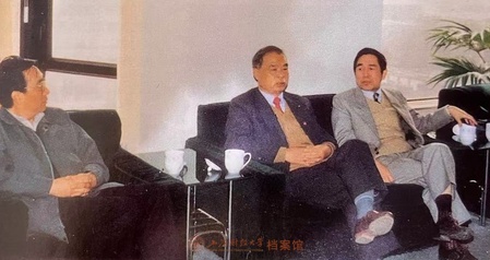 1991年4月,《人民日报》总编辑邵华泽(中)参观《文汇报》并与报社领导交流(右一为张启承)