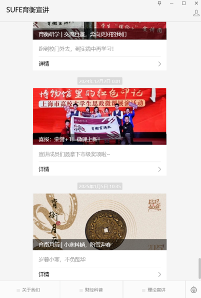 他们热情地接待每一位走进育衡楼想要了解上财百年路、商学发展史的观众,也会走进中小学课堂化身为小老师,告诉青少年们“我们手上的钱是怎么来的?”“原来保险也有好看的周边”,也会走进社区为弱势群体带去财经文化的滋养,还通过微视频、科普推文等方式助力知识传播与科普。
