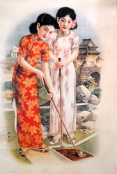 不仅如此,月份牌中呈现出来的女性生活场景也不再局限在一家一室,开始有了多样的生活方式。在画师杭樨英的笔下,女性无论在服饰还是形象上更加的摩登时尚,旗袍也从最初的宽松版型到后来凸显腰身曲线且花色夸张,留着时髦的卷发,脚穿高跟皮鞋;生活场景上也丰富多样了起来,从公园散步到高尔夫娱乐。画师们的笔触将女性的自信与从容展现出来,她们开始追求教育平等,追求健康、开朗、自我展示、积极上进,成为热销品的月份牌也引发了女性进一步的思考,促进社会女性在被动接受多元审美后进行自我身份的构建和思考,推动女性自我意识觉醒。