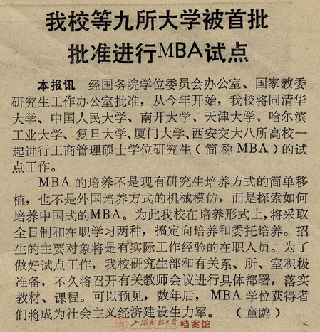 1991年3月30日,《上海财经大学校报》第119期报道“我校等九所大学被首批批准进行MBA试点”