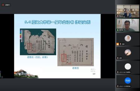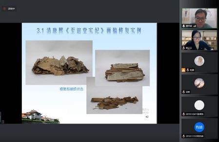 随后,谢老师介绍了厦门大学馆藏纸质文物及修复工作的一些典型实例,包括书画修复实例、书画装潢案例和档案修复案例等,还介绍了厦大历史系学生在档案馆开展的书画档案装潢与修复实践案例。