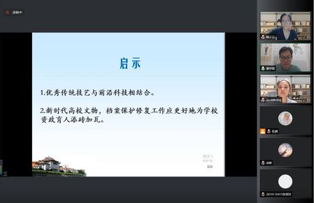 讲座的最后,档案馆(校史馆、博物馆)馆长喻世红老师做了简要的回顾与总结。她指出,本次讲座对档案文献的修复从理论和实践层面都做了一个非常系统和全面的介绍,让我们有机会深入了解修复师对那些极具历史文化价值、艺术价值的文物、档案、文献等进行修复工作的台前幕后。档案是国家和民族文化建立历史记忆、传承文明的重要载体,这些上百年甚至上千年的档案,在今天还能展示其原貌并让人从中体会到其所隐藏的古人智慧,皆因档案文物修复工作在其中发挥的重要作用。相信同学们通过这次讲座,能够对档案文献修复工作、对我们的档案守护人有了更深入的认识和了解。