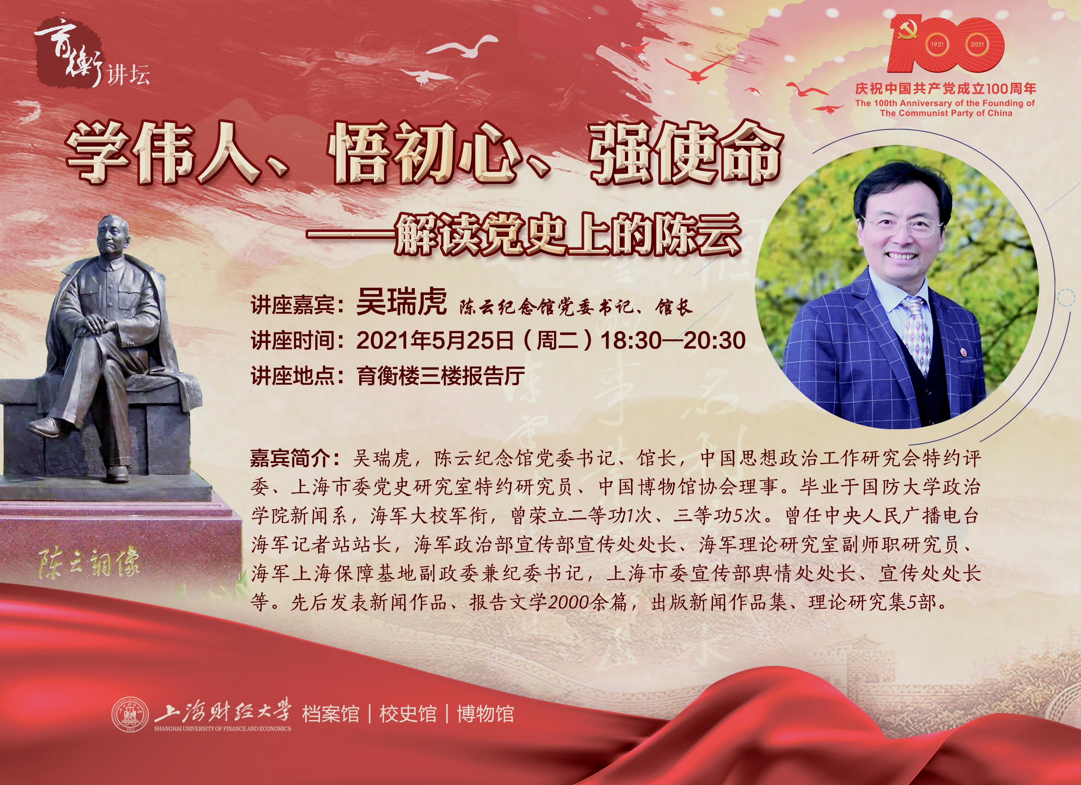 陈云同志是伟大的无产阶级革命家、政治家,杰出的马克思主义者,是中国社会主义经济建设的开创者和奠基人之一,党和国家久经考验的卓越领导人,是以毛泽东同志为核心的党的第一代中央领导集体和以邓小平同志为核心的党的第二代中央领导集体的重要成员,他为党、为国家、为人民建立的不朽功勋,是我们国家和民族的宝贵精神财富。值此中国共产党成立100周年之际,讲座围绕陈云同志的卓越贡献、家国情怀与崇高风范,弘扬红色传统、传承红色基因,解读党史上陈云同志的光辉故事。