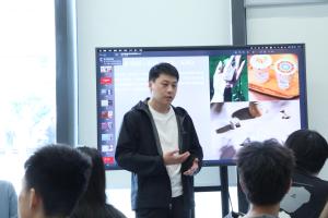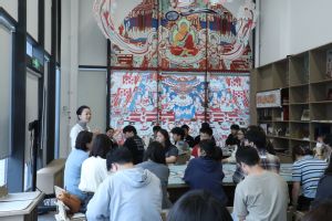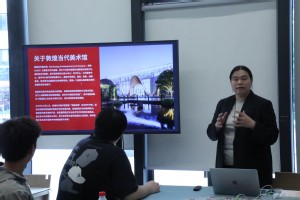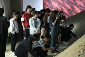 敦煌当代美术馆是一座以敦煌为原点的全新“艺术会客厅”。讲座伊始,杜馆长首先为大家导赏美术馆首展“境象敦煌”, 为同学们展开了一幅敦煌文化的宏大画卷。展览由历史、自然、再现、心象四部分构成,串联起同学们对敦煌的探寻踪迹。展厅中艺术家用不同的表达方式呈现出对于敦煌丰厚历史文化遗产的回应,让敦煌在地理概念之外更映射出一种文化符号的衍生。在杜馆长的诠释下,由自然香料所还原的迷你版“鸣沙山”、由上千块香云纱边角料制作的卧佛像以及敦煌艺术驻留项目等等当代艺术作品为同学们走进敦煌、看见敦煌、感受敦煌搭建起了一座桥梁。此外,杜馆长还为同学们介绍了美术馆已经开展的文创衍生、艺术字库等等,打开了同学们对于艺术、文化、经济的新视野。
