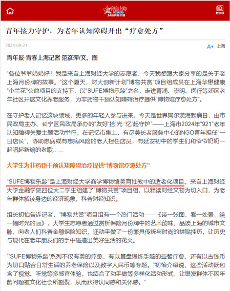 从“校园团队”到“青年名片”:不仅扎做好场馆内的志愿讲解服务,更带着品牌社教项目“SUFE博物乐龄”、“SUFE博物友爱”走近弱势群体身边,用文化润色心灵,相关事迹被《青年报》等媒体报道。