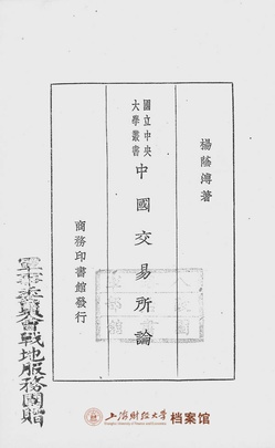 1930年,国立中央大学商学院第一批学术著作《上海金融组织概要》《中国国际贸易概论》《中国交易所论》出版,这是上财历史上第一批学术著作,也是国立中央大学第一套学术丛书——国立中央大学丛书的重要组成部分。这批著作的编写主要源于日常教学讲义的体系化整理,既立足于服务教学的根本需求,又展现出卓越的学术深度与理论水平。