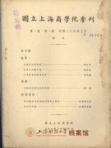 1937年3月,国立上海商学季刊第一卷第一期