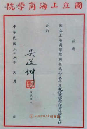 1946年7月,国立上海商学院发给吴道坤担任总务主任兼保险系主任的聘书