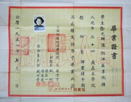 1951年7月,上海财政经济学院保险系学生徐之理的毕业证书,由院长孙冶方、副院长姚耐、褚葆一、褚凤仪,以及保险系主任关可贵共同署名签发,经华东军政委员会教育部钤印审核备案