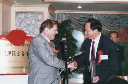 1996年中美合作项目协议达成时,时任上海财经大学校长汤云为与韦伯斯特大学校长理查德·迈耶斯(RichardMeyers)握手