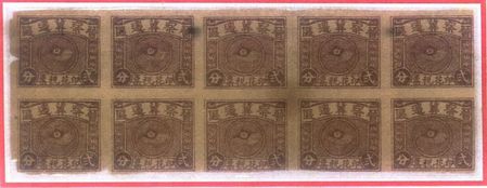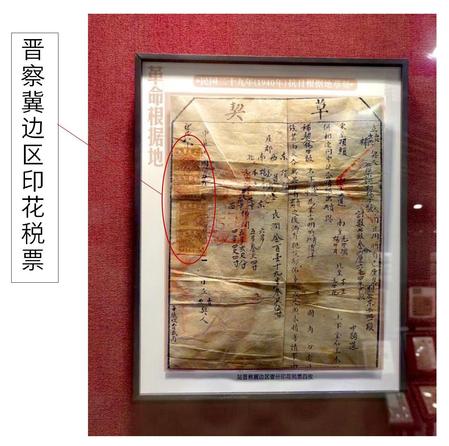 在上海财经大学商学博物馆税票馆展厅内,有1件《民国二十九年(1940年)抗日根据地草契》。《草契》左侧印花贴票处有四枚晋察冀边区印花税票,面值贰分,两枚一组裁切后贴于契书上,每组均有一个椭圆的戳记。有关研究显示,馆藏《草契》上所贴印花税票便是最早的一批“由中国共产党领导的红色区域发行的印花税票”。